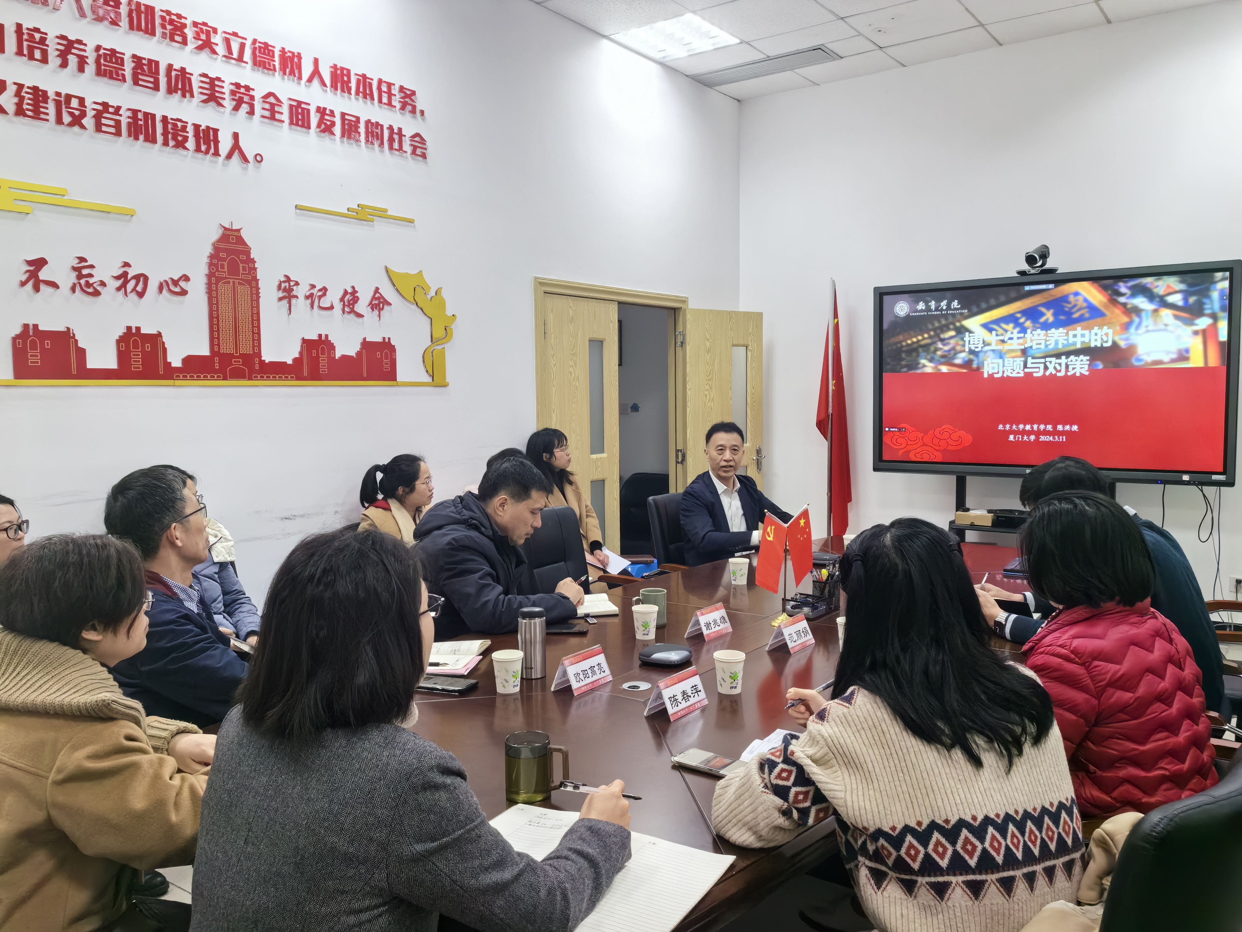 2024年3月11日下午,北京大学教育学院教授、北京大学博雅教授、北京大学中国博士教育研究中心主任陈洪捷受邀来到研究生院作题为《博士生培养中的问题与对策》专题讲座。讲座以线下线上相结合的方式进行,由教育研究院副院长、研究生院培养与管理办公室副主任(主持工作)郭建鹏主持,研究生院党支部书记、常务副院长谢兆雄、研究生院副院长欧阳高亮以及全院党员同志、教育研究院师生参加此次讲座,另有160余位导师及研究生秘书线上参加。