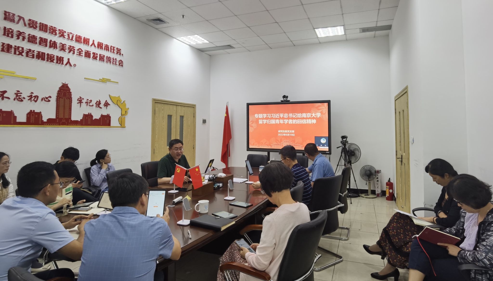 为推动学习习近平新时代中国特色社会主义思想常态化,统筹推进领导干部第一时间深入学习习近平总书记重要讲话重要指示批示精神和党中央重要决策部署,研究生院在院务会议上严格执行“第一议题”学习制度,切实用理论武装头脑、指导实践、推动工作。6月16日上午,研究生院党支部结合研究生院院务会议开展政治理论学习,专题学习习近平总书记给南京大学留学归国青年学者的回信精神。研究生院领导班子成员、全体党员参加学习。活动由研究生院党支部书记方颖主持。