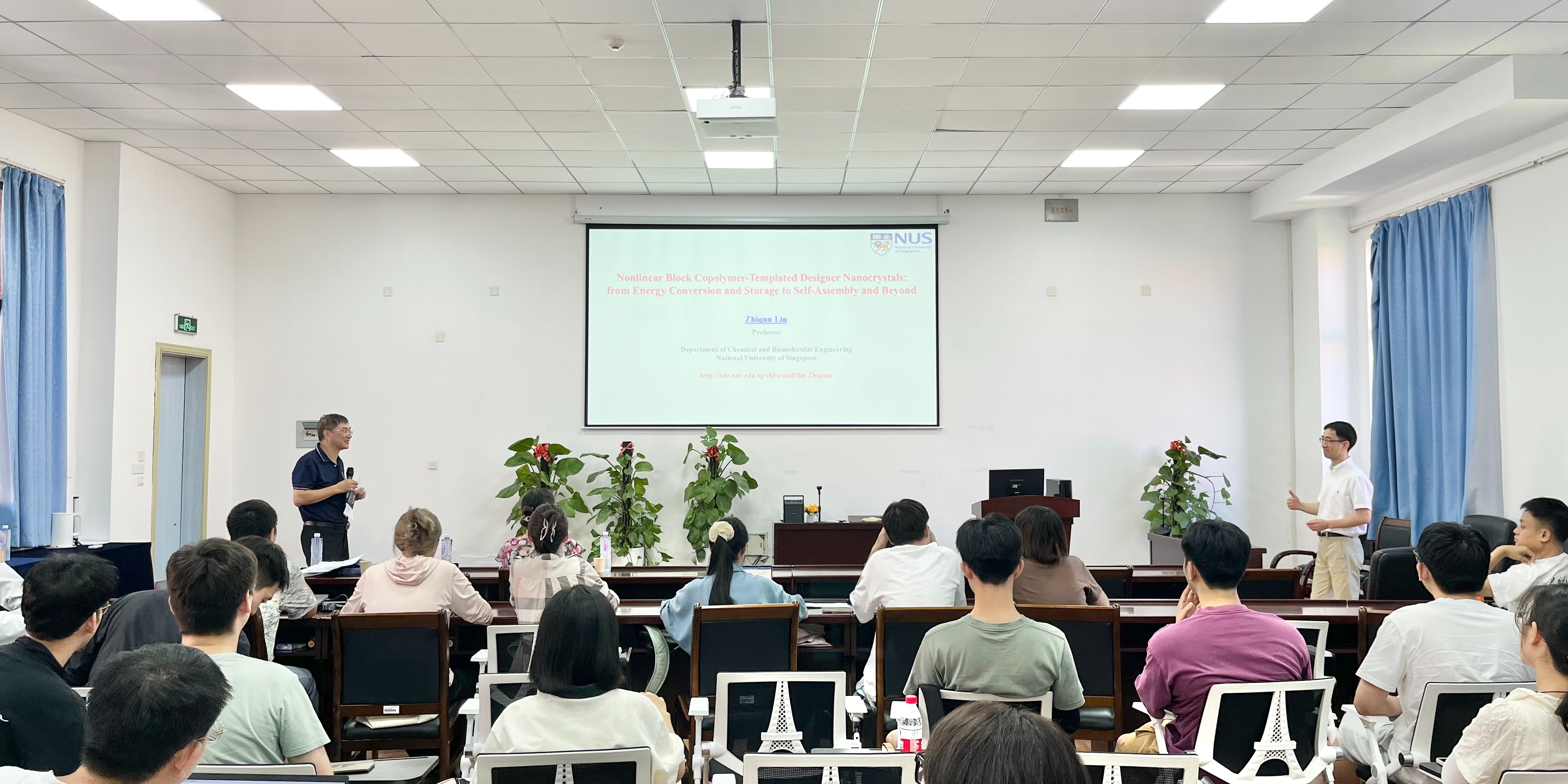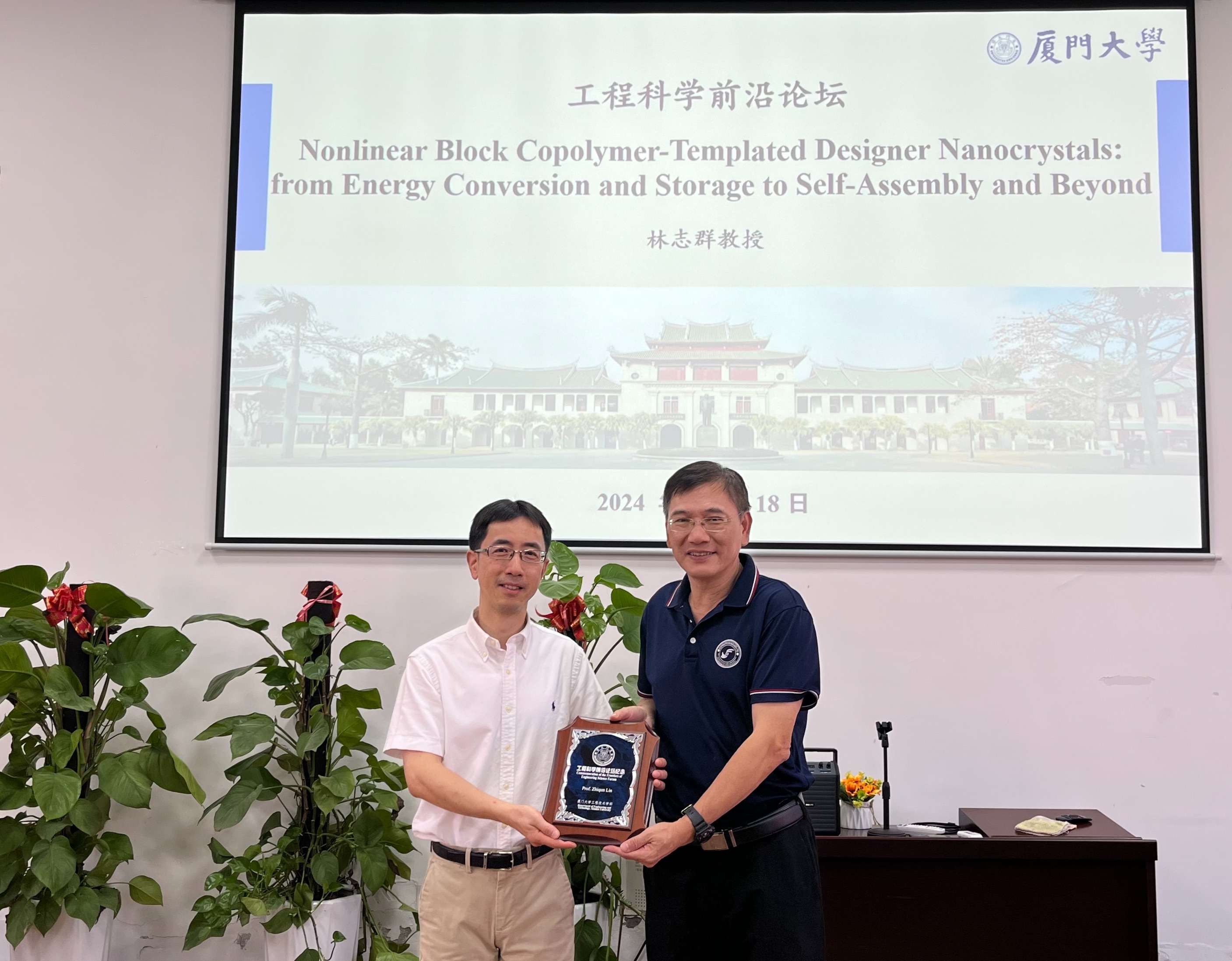 2024年7月18日上午,新加坡国立大学化学与生物分子工程系林志群教授应邀访问萨本栋微米纳米科学技术研究院,并出席厦门大学工程科学前沿论坛(第三期),在翔安校区文宣楼作题为“基于非线性嵌段聚合物纳米反应器的纳米晶体制备及其在能源转换、存储、自组装上的应用与展望(Nonlinear Block Copolymer-Templated Designer Nanocrystals: from Energy Conversion and Storage to Self-Assembly and Beyond)”的专题讲座。讲座由厦门大学工程技术学部主任、萨本栋微米纳米科学技术研究院院长洪明辉院士主持,50余位师生参加。