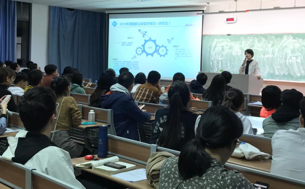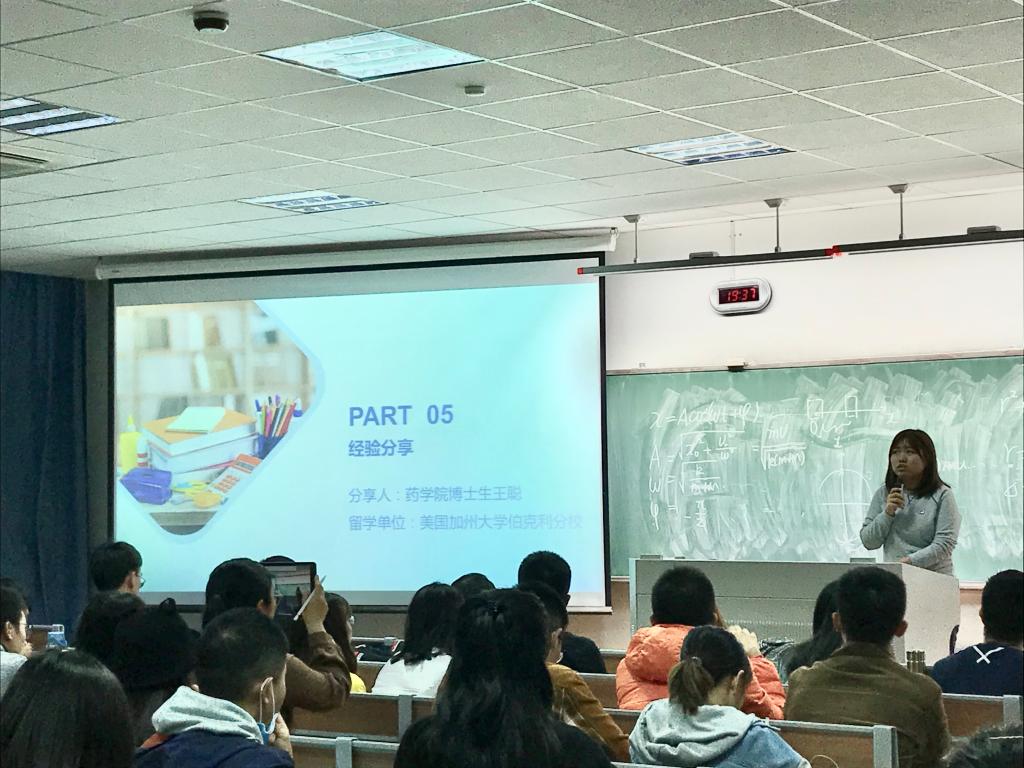 会上,研究生院老师陈权详细介绍了各类国家公派留学研究生项目、我校2019年的申请录取情况等,并就如何联系国外高校、准备申请材料等细节为同学们提供建议。随后,药学院博士生王聪与大家分享她前往美国加州大学伯克利分校进行联合培养期间的科研经历、生活经验等。同学们在答疑环节就所关心的如外语水平证书、资助期限、申请流程等内容踊跃提问,活动现场气氛热烈。