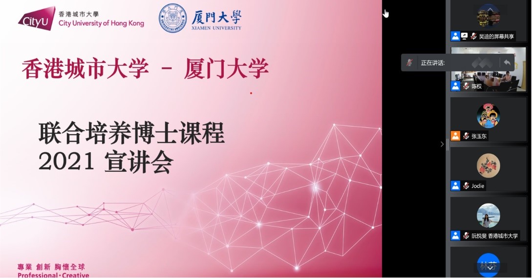 会上,双方回顾两校联培项目的招生与培养情况,并就如何进一步提升项目知名度和吸引本校优秀博士生参与展开了热烈讨论。余自中副院长肯定了该项目在提高我校研究生培养质量、拓宽博士生学术视野、提升学术交流能力等方面的积极作用。林芬博士感谢厦大研究生院对项目的重视与支持。她表示很高兴地看到今年报名参与宣讲会的人数大幅提升,城大将进一步创新推介形式和丰富宣讲内容,期待未来有更多厦大学子入选联培项目。