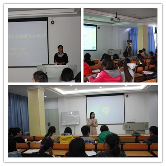2013年12月30日下午三点半到五点半,化学化工学院于化学楼6楼会议室举办了2014年国家公派研究生项目说明会。校公派出国项目负责人刘浥泓老师、院研究生教学秘书黄伟珺老师、往年公派出国研究生代表黄超、黄巧玲为到场的同学详细地解读国家公派研究生项目的有关内容。