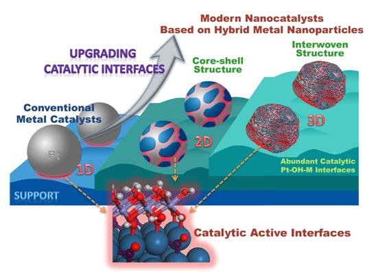 对于负载型贵金属催化剂,氧化物载体与金属纳米颗粒之间存在着微妙的金属-氧化物界面协同效应,因此不同氧化物负载的金属纳米颗粒在催化反应中的表现有很大差异。实际应用的催化剂体系往往过于复杂,很难通过现有表征技术剖析相关催化界面的精细结构,阻碍了研究者对催化剂作用机理和反应构效关系的深入研究。郑南峰教授课题组巧妙地运用湿化学方法制备了方便研究贵金属-氧化物界面效应的模型纳米催化剂,通过与校内外、国内外多个课题组紧密协作,结合先进表征手段和理论模拟深入研究了Pt-FeNi(OH)x界面协同促进CO催化氧化的机理。基于对催化机理的深入认识,他们进一步发展了更为实用Pt基催化剂的制备方法,使反应活性界面从传统催化剂的一维向三维发展,活性位与总铂原子数的比例可达50%以上。 所研制的新型催化剂不仅能在室温下实现一氧化碳的催化氧化、 还可催化富氢条件下一氧化碳的选择性氧化、富氧下少量氢气的清除,催化寿命可以长达1个月以上。