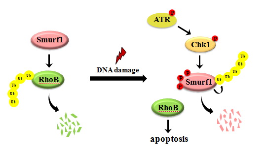 Rho家族小分子G蛋白是细胞内重要的调控分子,它们作为分子开关,参与调控了细胞内众多的生理生化过程。RhoA、RhoB和RhoC是这个家族中同源性很高的三个成员,其氨基酸序列的一致性高达85%。然而,尽管三者在调控细胞骨架的形成中都起着重要的作用,但是它们在调节许多其它的细胞生物学功能中的作用不尽相同。与相对稳定的RhoA、RhoC蛋白分子不同,RhoB特异性的参与DNA损伤引起的细胞凋亡来抑制肿瘤生长,而作为一个在细胞内会被很快的泛素化降解的短寿蛋白,负责调控其蛋白稳定性的E3泛素连接酶尚不清楚。王洪睿课题组发现了HECT家族的E3泛素连接酶Smurf1可以通过介导RhoB的泛素化降解来调控RhoB的蛋白水平,并在DNA损伤所引起的细胞凋亡中起着重要的决定作用。紫外照射或烷基化试剂处理导致的单链DNA损伤激活ATR/Chk1信号通路,激活的Chk1通过磷酸化Smurf1加速其自身泛素化降解,使得RhoB的蛋白水平显著提高,从而促进了细胞的凋亡。同时,该研究指出了Smurf1在肿瘤中高表达可能会导致RhoB的过度泛素化降解,进而在肿瘤的发生过程中起着重要的作用。