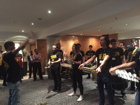 11月8日一整天的课程结束后,主办方FGV商学院为OneMBA同学准备了鸡尾酒会。各个国际小组的同学虽然平日一直都不断联系,但面对面要讲的话似乎更多。就在大家叙旧寒暄之时,动感的打击乐团忽然出现,着实给了大家大大的惊喜。热力十足的鼓乐更是带动出了全场同学的劲舞,嗨翻屋顶。