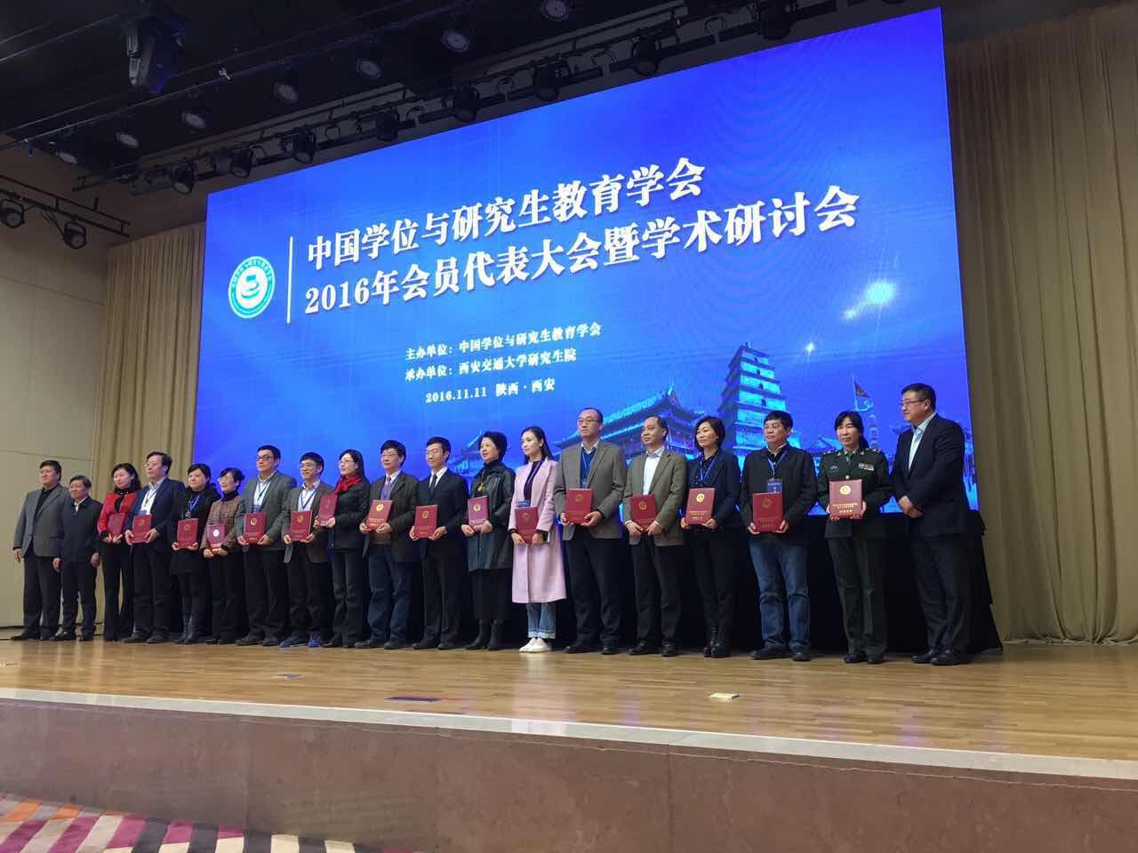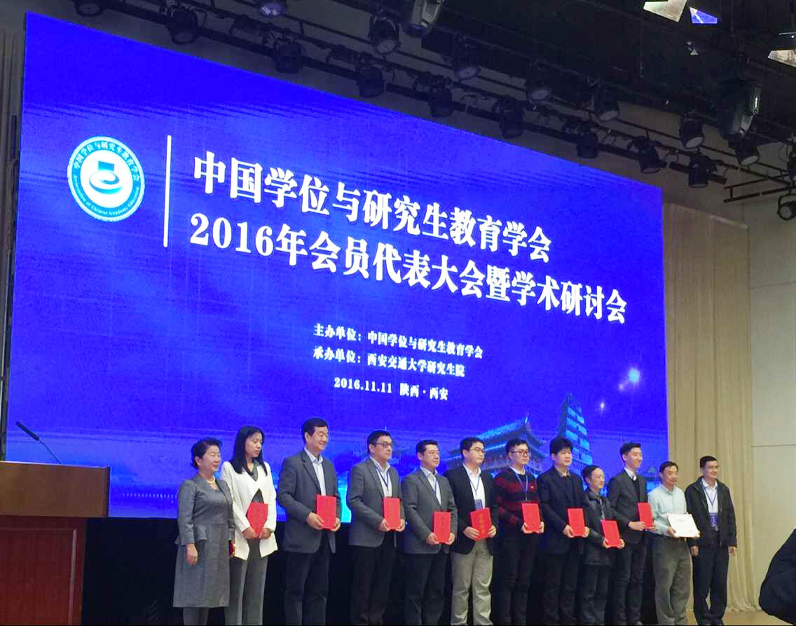 11月11日,中国学位与研究生教育学会2016年会员代表大会暨学术研讨会在西安召开,中国学位与研究生教育学会会长,教育部原副部长赵沁平院士、教育部研究生司司长李军和西安交通大学王树国校长等出席。本次会议的主题是改革创新,特色发展,建设研究生教育强国。会议对获得第二届中国学位与研究生教育学会研究生教育成果奖等奖项的集体和个人进行了颁奖。我校研究生院团队(陶涛,陈工,范丽娟,薛成龙和徐岚)申报的“遵循人才培养规律,严格研究生培养过程管理”成果获得中国学位与研究生教育学会研究生教育成果二等奖,教育研究院博士生包水梅(导师:王洪才)获得第五届学位与研究生教育优秀博士学位论文,研究生院常务副院长陶涛教授获得第一届中国学位与研究生教育学会工作贡献奖。