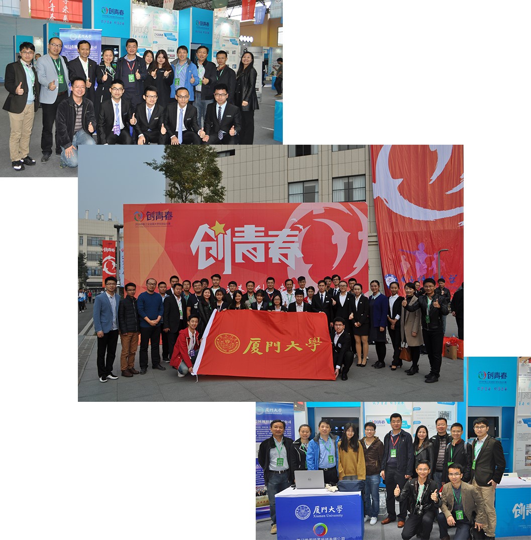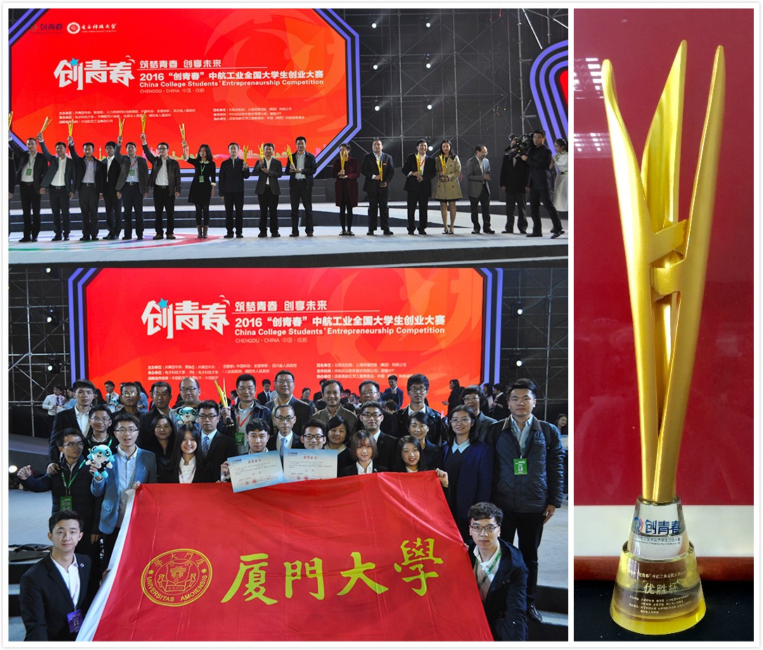 2016年11月15日至19日,由共青团中央、教育部、人力资源和社会保障部、中国科协、全国学联、四川省人民政府联合主办的2016年“创青春”(原“挑战杯”)全国大学生创业大赛在成都市电子科技大学举办。经过激烈角逐,我校代表团取得2金3银1铜的优异成绩,总积分位于全国高校前列,再次捧得大赛“优胜杯”(全国仅有20所高校获此殊荣),并获“高校优秀组织奖”,再创参赛佳绩。其中,由物理与科学技术学院2014级硕士生梁添、管理学院2015级硕士生吴丹担任负责人的《厦门桑德科技有限公司》、软件学院2013级本科生李秀东担任负责人的《厦门爱图视界科技有限公司》获得金奖,由医学院2015届博士毕业生王燊担任总经理的《厦门弧形世界医疗科技有限公司》、管理学院2014届硕士毕业生郭奇担任CEO的《厦门云境智能科技有限公司》、医学院2014级本科生陈漳鑫担任负责人的《厦门医宝贝教育咨询有限公司》获得银奖,生命科学学院2011级博士生王震担任董事长的《厦门安提海拉科技有限公司》获得铜奖。