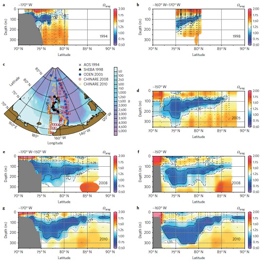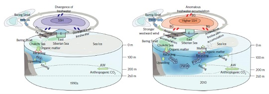 论文通过对过去20年来5个北冰洋航次数据进行的精细分析,采用化学示踪和模型模拟,发现全球气候变化引起了北冰洋环流模式异常、北冰洋海冰覆盖面积快速后退驱动着太平洋冬季水(携带“腐蚀性”的酸化海水)的大范围入侵(图2),导致了北冰洋酸化水体快速扩张,并以每年1.5%截面积的速率增长,预估到本世纪中叶整个西北冰洋将被酸化水所覆盖!西北冰洋快速酸化对海洋生物具有重要影响,尤其是蛤蚌、贻贝、海螺等钙质外壳生物,在快速酸化的水体中,它们将更难形成或维持其外壳。此外,翼足目类海螺是北冰洋食物链中重要的一环,是北极三文鱼和鲱鱼重要的食物,其总量下降将对北冰洋生态系统造成严重影响。
