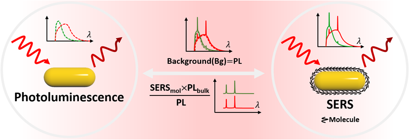 在该工作中,任斌教授课题组采用单粒子光谱技术从实验上直接检测SERS光谱和金属纳米粒子的光致发光谱(PL),通过定量研究两者的关联,提出了一种普适的方法矫正LSPR对不同拉曼谱峰相对强度的影响,为理解表面物种构型和作用方式提供了本征的化学指纹信息。他们发现SERS光谱的背景(Bg)主要源自金属纳米结构的PL,而该PL是受纳米结构LSPR调制放大的贵金属本体发光(PL=Bg=PLbulkLSPR),因此与分子的SERS有着相同的调制机制(SERSmol=RamanLSPR)。为此,只要利用实验上测出的金属本体发光谱(PLbulk)和吸附分子的SERS光谱(SERS=SERSmol+Bg),就可以还原出表面分子的本征化学信息(Raman)。理论结果很好的解释了该方法的可靠性。同时,该方法也在更为复杂的纳米粒子聚集体和针尖增强拉曼光谱体系得到很好的印证。