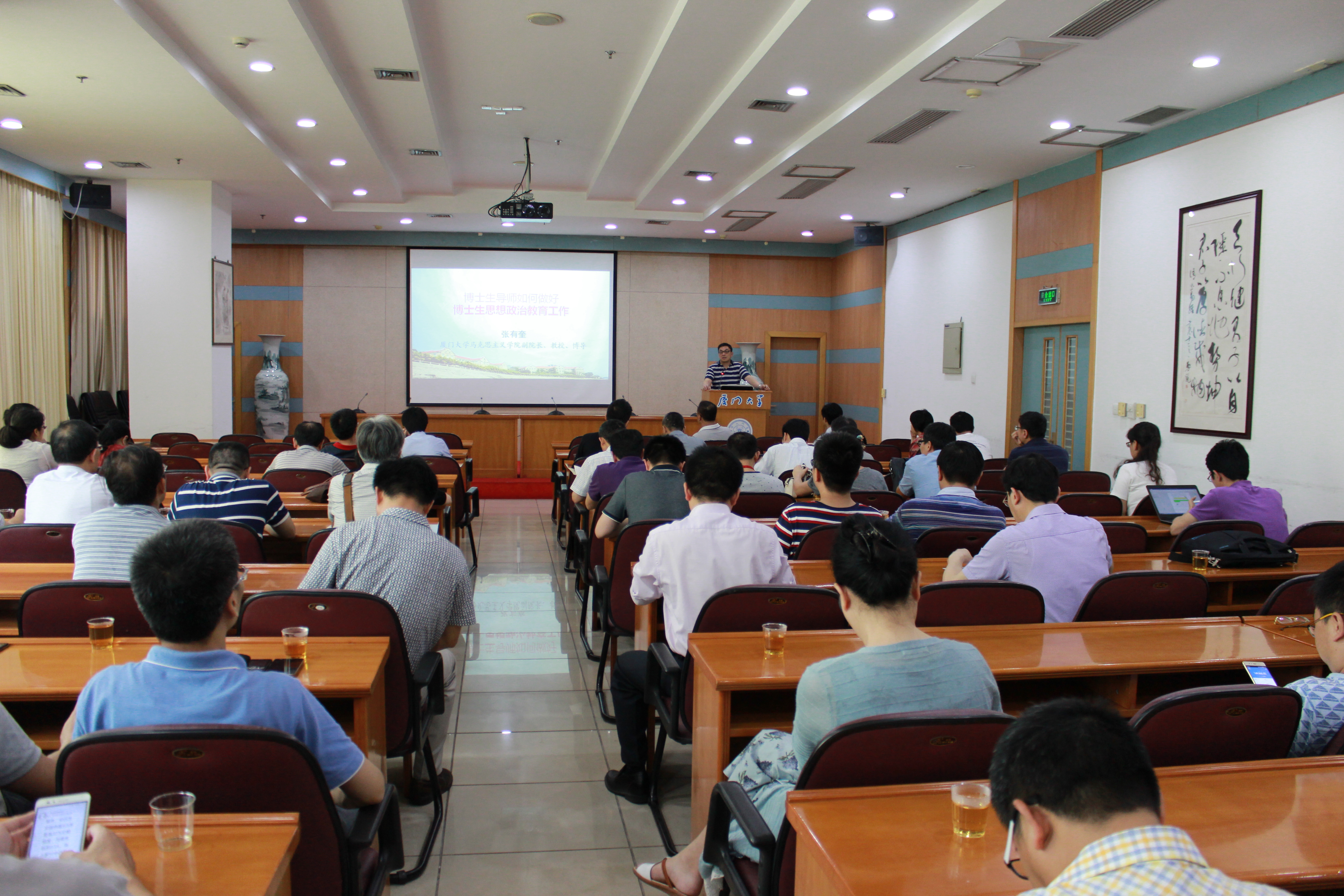 为了全面贯彻全国高校思想政治工作会议精神,并将我校思想政治工作会议的决策部署落到实处,把思想政治工作贯穿研究生教育教学全过程,同时进一步提升研究生导师的思想政治素质,建设高水平的研究生导师队伍,5月12日研究生院邀请厦门大学马克思主义学院副院长,博士生导师张有奎教授作题为《博士生导师如何做好博士生思想政治教育工作》的讲座,并与教师们进行了经验交流。各学院、研究院分管研究生工作的副院长和副书记以及2015年、2016年新增博士生导师参加讲座。讲座由研究生院常务副院长陶涛教授主持。