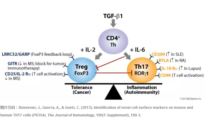 自身免疫性疾病是一类机体对自身抗原发生免疫反应而导致自身多器官、组织受累的慢性炎症性疾病,如克罗恩肠炎、类风湿性关节炎和干燥综合征等。目前大量研究表明机体内促炎症的TH17细胞和抑制炎症Treg细胞在类群数量和活化状态的失衡是造成自身免疫疾病的主要致病因素(下图)。