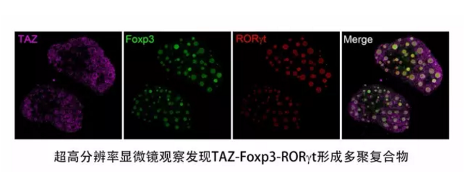 针对TAZ在TH17细胞培养分化条件下被诱导表达的现象,他们进行了深入的研究发现诱导TH17细胞分化的两大信号IL-6和TGF-β下游的转录因子Smad3和STAT3协同促进TAZ基因的转录和表达。利用超高分辨率显微镜GE OMX V4观察和生化手段验证后发现,多聚化的TAZ能够同时与TH17细胞的核心转录因子RORgt和Treg细胞关键转录因子Foxp3形成复合物(下图),TAZ能够促进RORgt转录活性但抑制Foxp3的功能,从而促进TH17细胞的分化和减弱Treg细胞的产生。