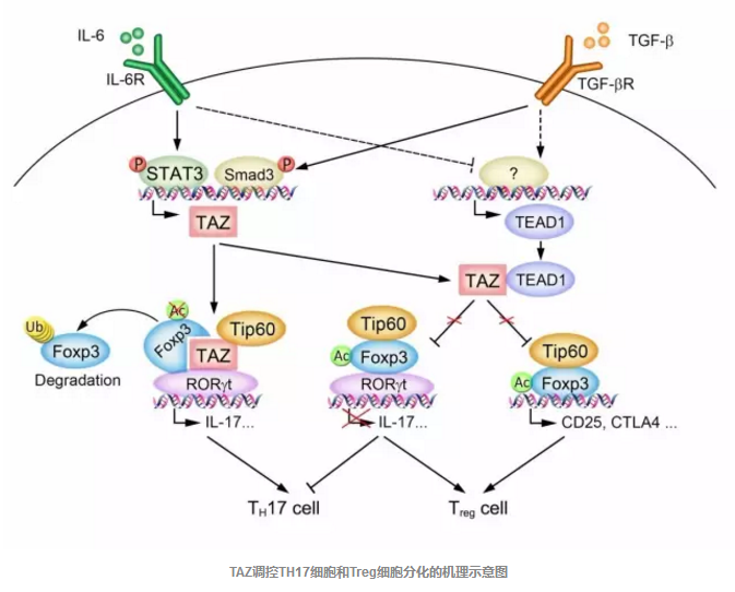 本项研究阐明了TAZ在调节CD4+初始T细胞分化为TH17细胞和Treg细胞的过程中发挥着关键调控作用和重要机理。该项研究对多种自身免疫性疾病的发病机理提供理论依据,也为早期诊断和治疗慢性炎症性疾病提供可能的分子标志物和治疗靶标。