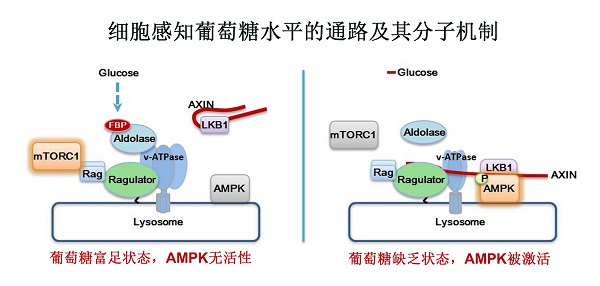 林圣彩教授课题组的这项研究正是发现了生理状态下机体感受葡萄糖水平的机制。通过研究他们发现,无论在不含葡萄糖的细胞培养条件下,还是在饥饿的低血糖的动物体内,都不能观测到AMP水平的上升,这充分说明了机体有一套尚不为人知的、独立于AMP的感应葡萄糖水平的机制。在进一步的研究中他们揭示了这一完整过程:葡萄糖水平下降将引起的葡萄糖代谢中间物——果糖1,6-二磷酸(fructose-1,6-bisphosphate)水平的下降,该过程进一步地被糖酵解通路上的代谢酶——醛缩酶(aldolase)感应,因为醛缩酶正是将含有6个碳原子的果糖1,6-二磷酸裂解成三碳糖的酶,一旦醛缩酶“吃不到”由葡萄糖衍生的果糖1,6-二磷酸,它便“翻脸”,传递给也正是林圣彩教授课题组先前发现的溶酶体途径进而激活AMPK。该过程完全不涉及AMP水平,即能量水平的变化,是一条全新的、完全建立在实际的生理情况上的通路。