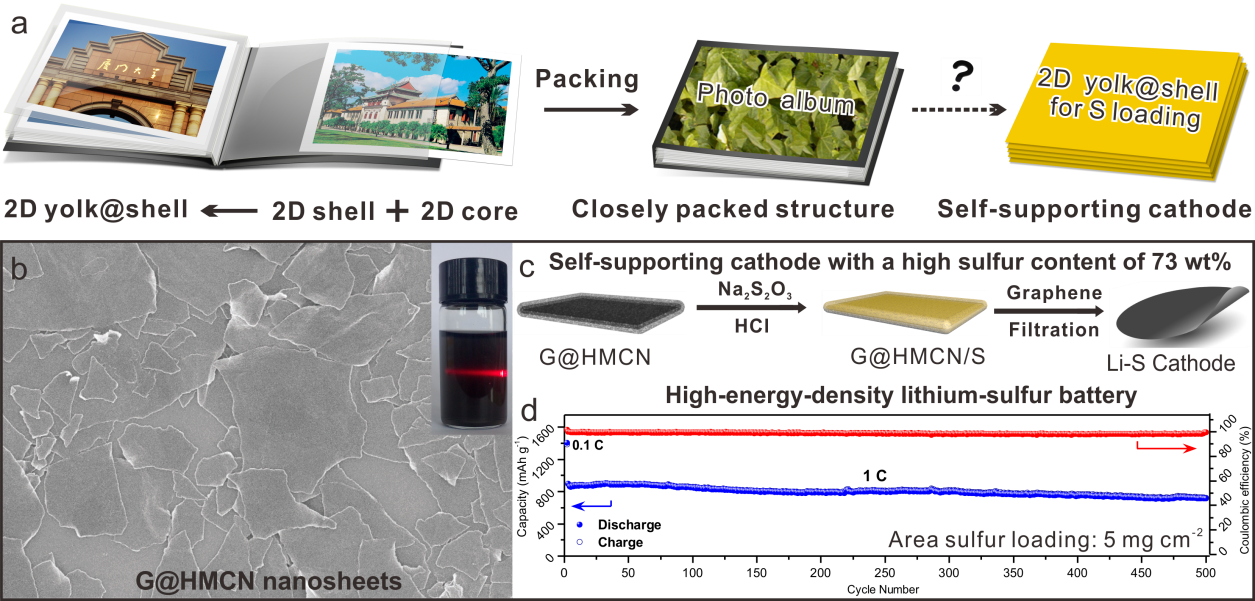 受老式相册的紧密堆积结构启发,该研究将石墨烯包裹于中空多孔碳纳米片的内部腔体中形成一种具有“蛋黄-壳”结构的新型二维碳纳米材料(G@HMCN)。由于具有高比表面积和孔容、丰富的N原子掺杂和良好的分散性,G@HMCN能够制备载硫量高达80.5 wt%的碳硫复合物(G@HMCN/S)。通过简单的真空抽滤法,G@HMCN/S和商品化的石墨烯可以组装形成具有紧密堆积的自支撑正极(G@HMCN/S-G)。在载硫量高达73 wt%和面积载硫量为5~10 mg cm-2的条件下,G@HMCN/S-G拥有高倍率性能(5C倍率下容量524 mAh g-1)和优异的循环稳定性(1 C倍率下500次循环后容量719 mAh g-1),同时可以兼顾高面积容量(11.4 mAh cm-2)与高体积容量(1329 mAh cm-3)。该研究工作为高能量密度Li-S电池的发展提供了新机遇。所开发的新型二维多孔碳纳米材料还有望应用于其它研究领域,如超级电容器、异相催化和电催化、柔性储能器件。