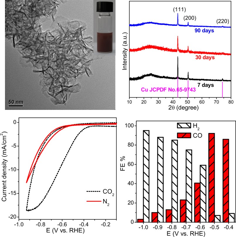 金属铜表面很容易被空气氧化,因此铜纳米材料在空气中极不稳定,如何制备原子级厚度的二维铜纳米片一直是纳米材料领域的一个挑战性难题。在该项研究工作中,郑南峰课题组首先利用“溶度积”这一简单概念,通过离子溶出-沉淀平衡将Cu(II)沉积于预先形成的超薄氢氧化镍纳米片上,在溶液中存在大量甲酸根的条件下,形成表面富含Cu(II)并配位有甲酸根的氢氧化物纳米片。在后续加热过程中,表面配位的甲酸根将表面Cu(II)逐步还原为氧化亚铜直至金属铜,最终得到可在空气中稳定数月的铜-氢氧化镍复合纳米片。这些纳米片上的超薄金属铜之所以能得以稳定主要是因为其表面配体甲酸根的保护作用,在热力学上甲酸根较金属铜更易被氧化,但空气氧化甲酸根的动力学却很慢,甲酸根的表面配位作用无形中就保护了铜不被空气氧化。重要的是,他们课题组还初步发现了所发展的方法对保护金属铜表面具普适性,具重要应用潜力。该项研究还发现所合成的复合纳米材料能够将二氧化碳和水选择性地电化学还原为组成可调的合成气(一氧化碳和氢气混合气),在较低的还原电位下可高选择性地将二氧化碳还原成一氧化碳(其法拉第效率高达92%)。铜基纳米材料在二氧化碳电化学还原中具有优异的性能,但产物异常多样,选择性控制的难度很大。该项工作利用简单的表面配位修饰大幅改善电催化选择性的策略为二氧化碳还原电催化剂的设计提供了新思路。