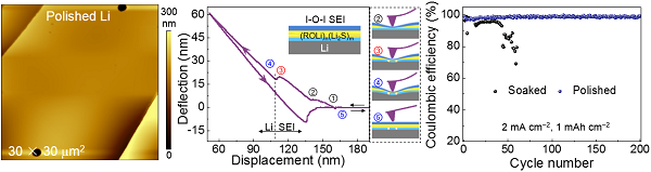 金属锂是下一代高能量密度二次电池最理想的负极材料之一。在以金属锂作为负极的电池中,锂电沉积过程中枝晶的生长及溶解过程的死锂现象是制约电池库仑效率、稳定性和安全性的重要因素,而金属锂表面的微观平整性及固态电解质界面(SEI)膜的组成和结构及由其所决定的电学和力学性质对锂电沉积和溶解行为有重要影响。