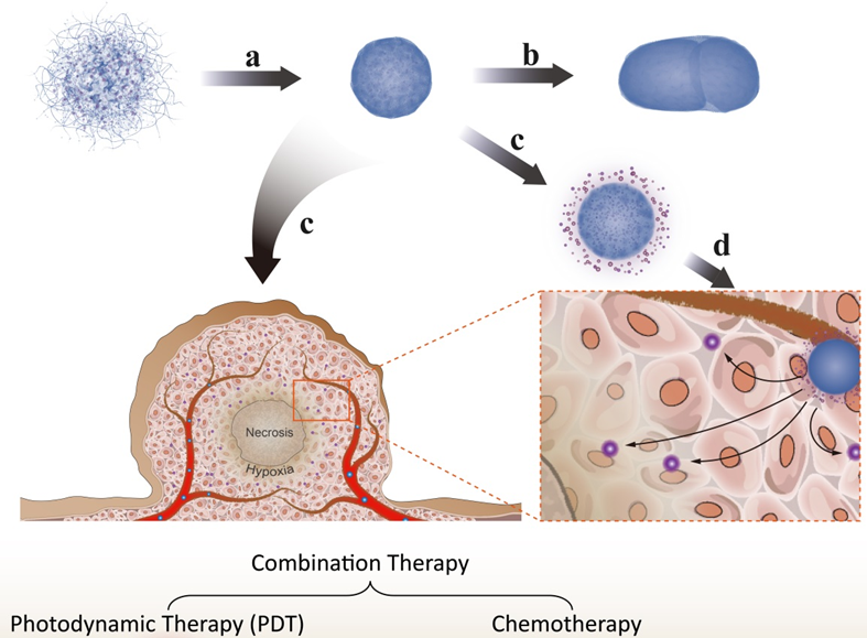近年来,如何提高纳米药物的药物装载率并实现其有效运输、克服体内复杂的生物屏障是肿瘤治疗的难点,而肿瘤微环境响应的超小纳米药物产生体可能提供了一个较好的解决方案,课题组前期基于吲哚菁绿ICG以及金属离子之间配位发表了一系列的工作,如纳米药物的体内自组装(Adv. Mater., 2017, 29:1605928),以及微泡内部原位形成Fe3+/ICG自组装纳米材料用于肝癌声动力治疗等(Nanoscale Horiz., 2018, DOI:10.1039/C8NH00276B;申请专利号:201810461899.5)。本研究中张鹏飞等将卟啉类光敏剂DVDMS和化疗药物阿霉素(DOX)以及三价铁离子经体外自组装,通过一锅法,迅速大规模地制备了具有超高药物装载率特点的纳米药物复合体(药物装载率大于78%),并发现该纳米药物复合体在肿瘤弱酸条件下,可以从起始140纳米大颗粒降解产生超小纳米药物(5-8纳米)。该特性可以有效地增加纳米颗粒的肿瘤穿透性,促进纳米药物在肿瘤高间质压环境下的有效扩散,并获得了良好的肿瘤治疗效果。本论文中也提出了多药物自组装相关的形成机制,为利用多种临床药物自组装成无载体的纳米药物复合体提供了坚实的理论基础。由于该纳米药物复合体只利用药物分子和金属离子的配位所构建,避免了其他无机纳米载体的使用,易于大规模生产,因此具有良好的临床转化潜力。