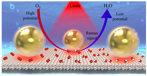 铂基催化剂表面的氧还原反应(ORR)是燃料电池重最重要的阴极反应。虽然经过几十年的研究,ORR的具体反应路径并没有真正解析清楚。人们一般认为铂表面的ORR过程可分为两类:一类是氧分子经过4电子的还原过程最终生成水或OH;另一类则是氧分子经过2电子的还原过程,生成过氧化物。但ORR过程在实际铂基催化剂表面的反应路径并未形成共识,因为该过程牵涉到众多痕量、短寿命的中间物种,难以被有效地捕获。同时复杂电化学环境也给ORR反应路径和机理的研究带来挑战。虽然原子级平滑的单晶表面具有确定的表面原子排布结构以及表面能级,是关联实验和理论的理想模型体系。然而原子级光滑的单晶表面难以获得增强的拉曼信号,无法获得直接的光谱证据,限制了人们对ORR反应过程的理解并用其指导高活性催化剂的制备。