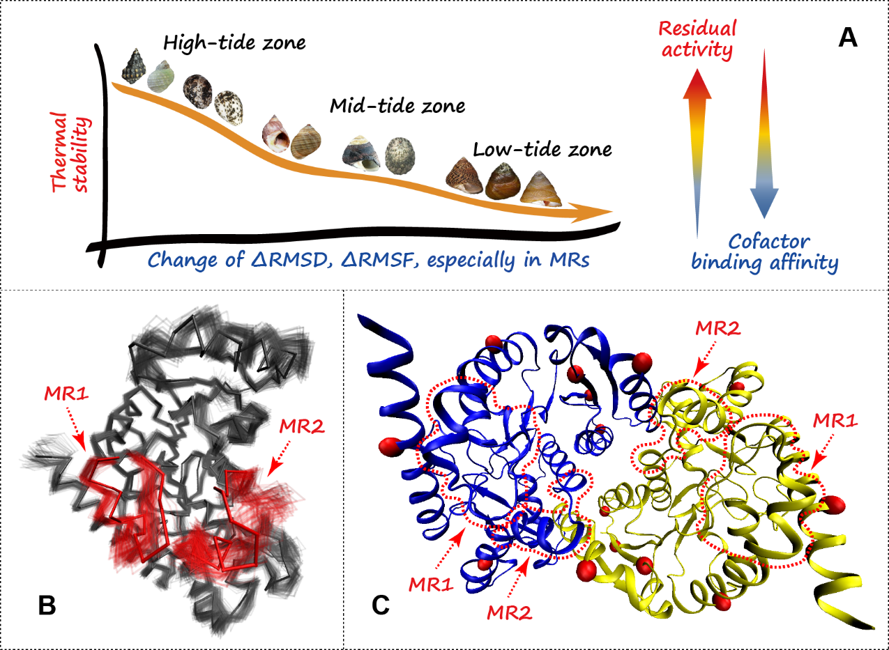 基于上述基础,课题组进一步拓展研究的深度与广度,比较分析了从南极洲半致死温度仅为 4 °C 的扇贝,到中国沿海可耐受 60 °C 以上高温的滨螺等26种海洋软体动物 cMDH 的温度耐受性,提出了蛋白质不同区域氨基酸的温度适应性变化模式,通过分子动力学分析揭示了具有重要功能的区域及其作用机制。这一系列研究成果加深了对海洋生物蛋白质温度适应机制的认识,为该领域提供了新的研究模式与思路,对于查明环境温度对生物分布的影响及其机制,预测气候变暖的生态学效应具有重要意义。