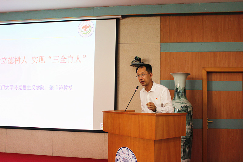 首先,马克思主义学院副院长张艳涛做作题为《坚持立德树人 实现“三全育人”》的报告。他全面解析了立德树人这项根本任务与 “三全育人”的实质内涵。他指出,教学秘书要有“等不起”的急迫感,“慢不得”的危机感,“坐不住”的责任感,坚持“十体系联动”,不断提升人才培养的针对性和实效性,共同推动学校“双一流”建设。