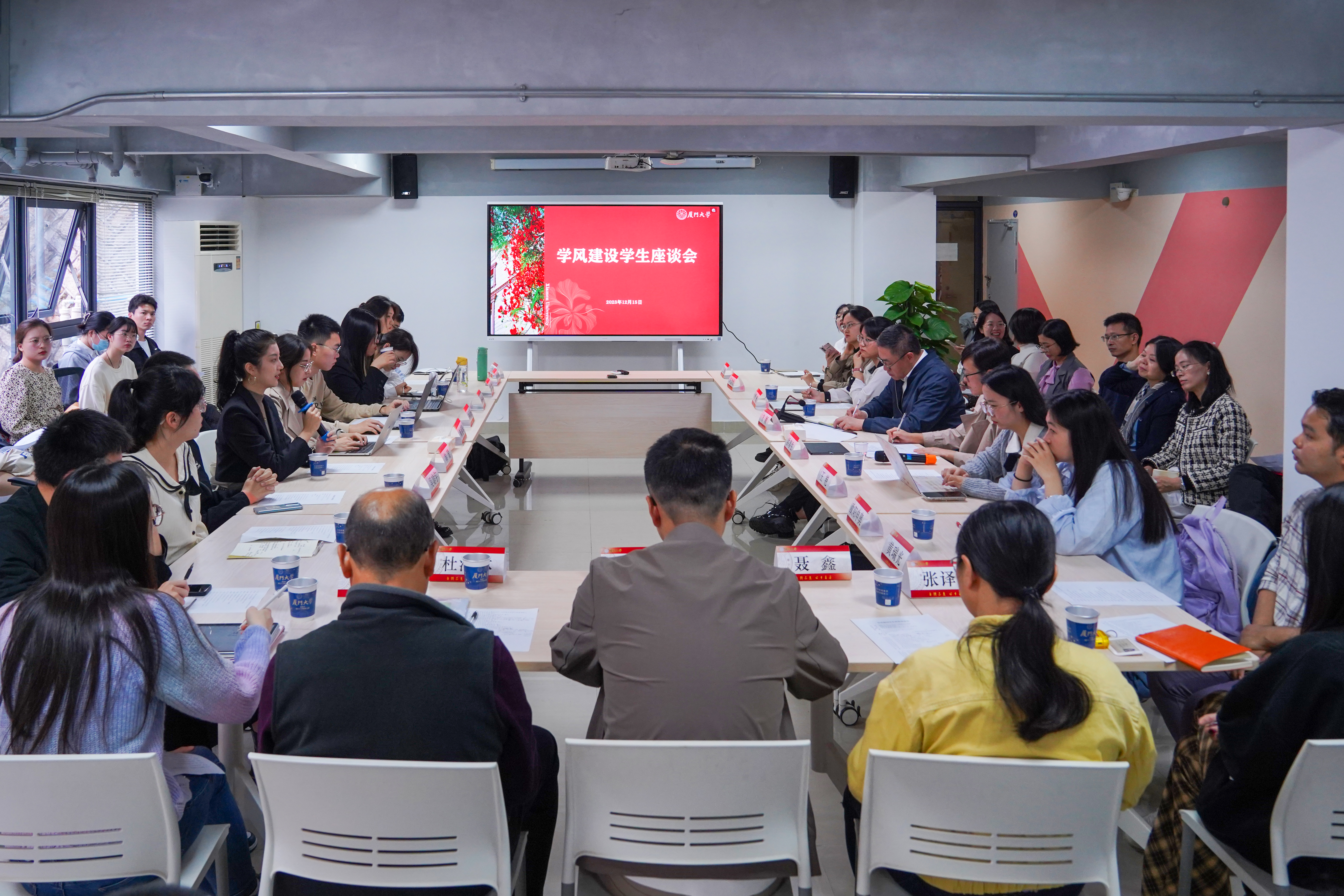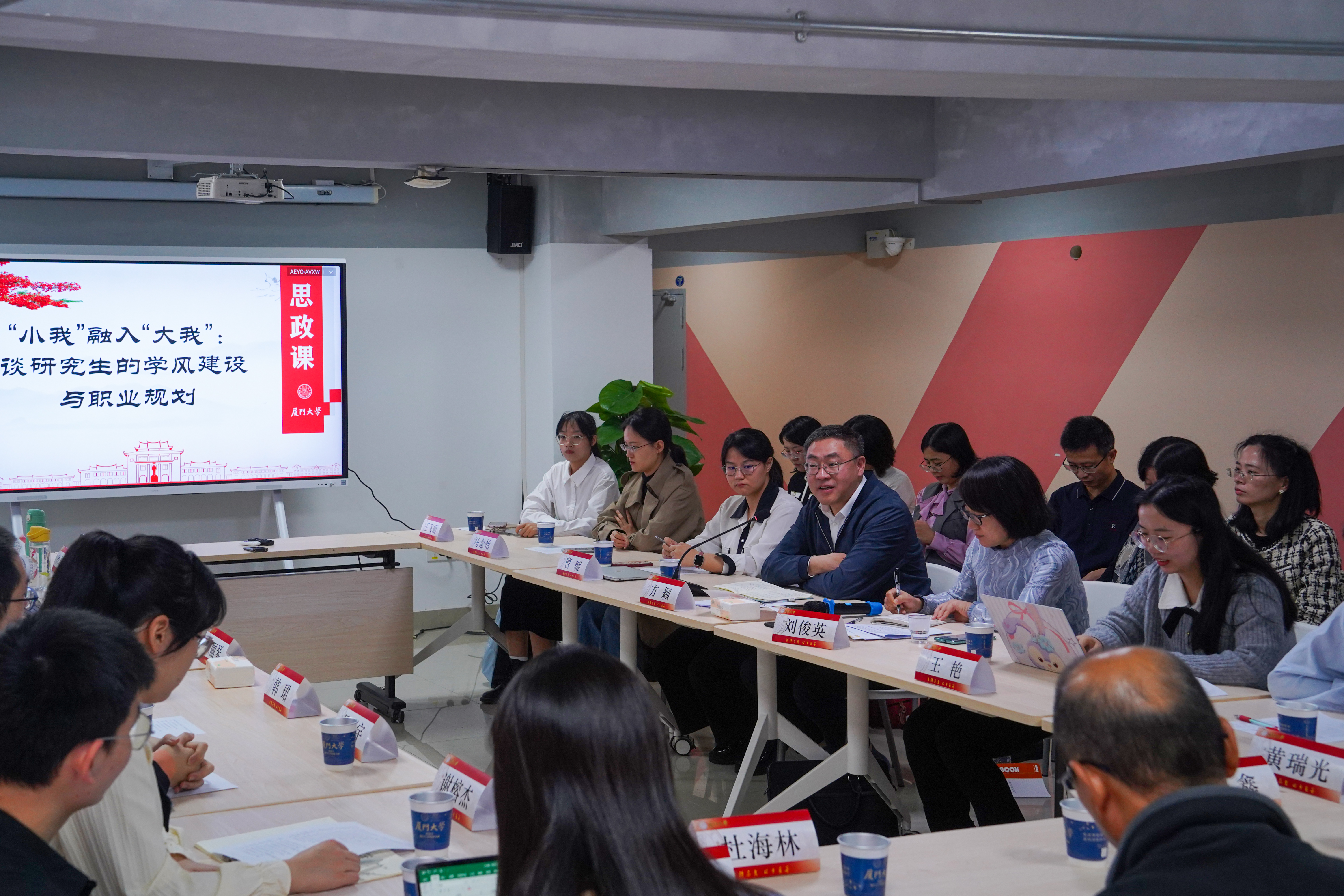 为深入学习贯彻习近平新时代中国特色社会主义思想,贯彻落实学校第十二次党代会精神,切实落实立德树人根本任务,实施“博学至善”行动,坚持育人为本、质量为先,进一步加强学风建设,促进创新人才自主培养的质量提升,12月15日上午,我校学风建设学生代表座谈会暨思政课在海韵一站式学生社区举行。厦门大学副校长兼研究生院常务副院长方颖与来自思明校区各院系的26名国内和国际研究生代表座谈,共同就我校拔尖创新人才培养工作及同学们关心的热点话题进行交流沟通,并给同学们讲授了一堂生动的思政课《“小我”融入“大我”:谈研究生的学风建设与职业规划》。学生工作部(处)部(处)长洪春生主持座谈会。学生工作部(处)、研究生院、校团委等职能部门负责人,部分学院分管党委副书记、分管教学副院长、辅导员及研究生秘书等出席座谈会。