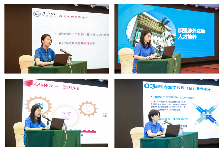 经验分享交流环节,外文学院邹柳新、法学院黄小红、生命科学学院张瑜、信息学院聂岑娜4位老师立足学院、学科研究生教育管理工作并结合自身工作实际和工作心得进行了精彩的经验分享。